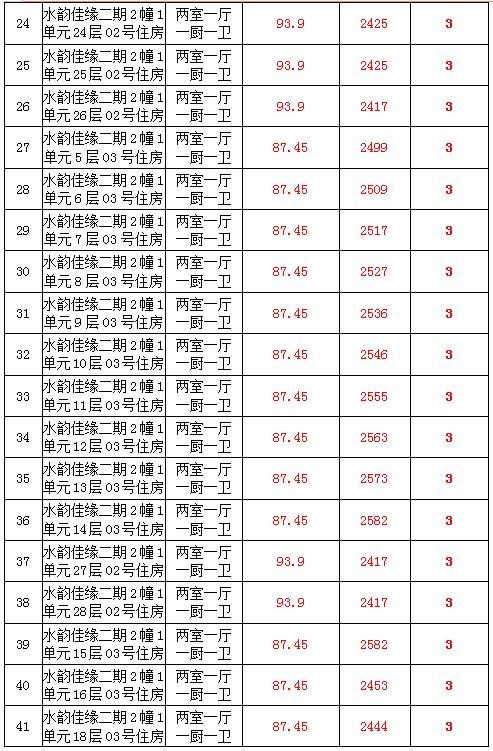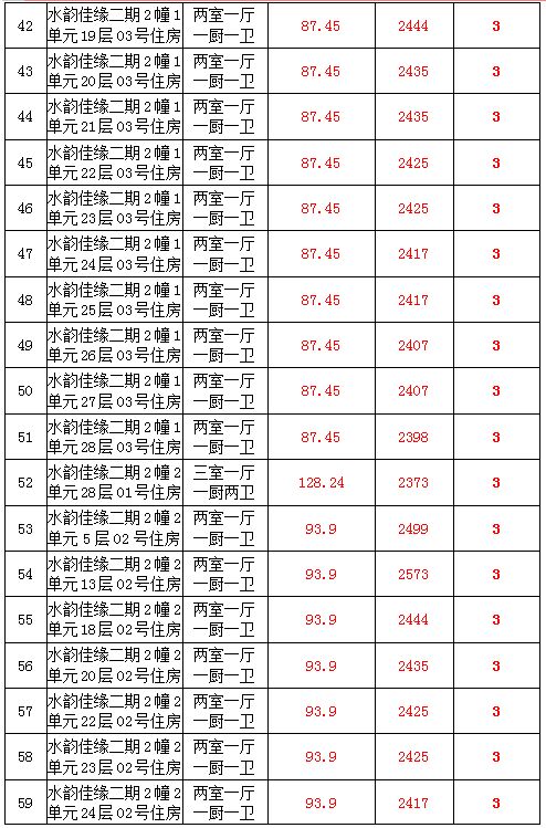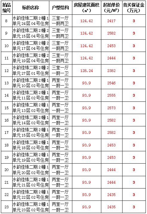 2、水韵佳缘82套住宅房产,建筑面积:87.45—128.24㎡,起拍价:2373—2582元/㎡;