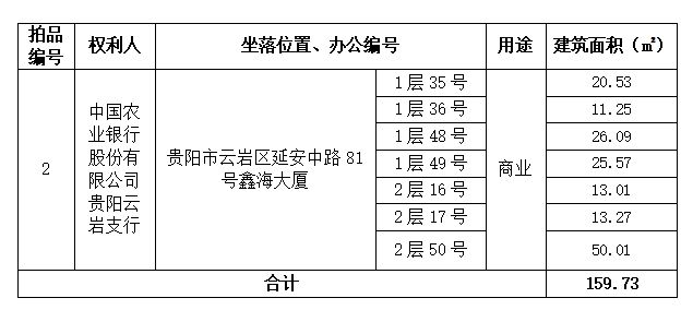 标的位于贵阳市云岩区延安中路81号鑫海大厦1层35、36、48、49号,2层16、17、50号,该标的总建筑面积为:159.73㎡,分摊土地使用权面积分别为0.76㎡、0.42㎡、0.96㎡、0.95㎡、0.48㎡、0.49㎡、1.85㎡;地类用途:商务金融用地,土地使用权类型为出让,土地使用权终止日期为2047年12月31日,土地所有权为国家所有;楼层:总层数27层,标的位于楼宇总层数27层的第1、2层,层高:住宅商业层高3.5m,住宅层高2.8m;建筑结构:框架结构。