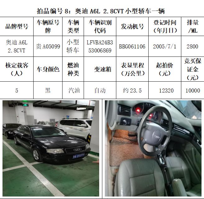受委托,本公司定于2021年3月26日(星期五)下午14:30时,在贵阳市中华南路20号新大陆数码广场10楼D座拍卖厅公开拍卖以下车辆:普拉多越野车1辆、超级维特拉越野车1辆、别克商务旅行车1辆、辉腾轿车1辆、途胜越野车1辆、雅阁轿车2辆、奥迪轿车1辆,长城牌小型越野客车1辆,共计9辆车。