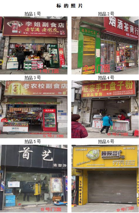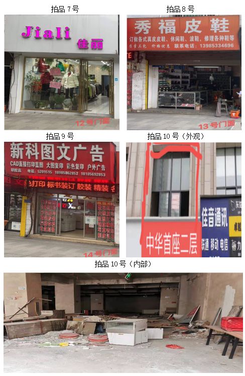 拍品1至9号标的:位于清水大道铜仁农校旁,地理位置优越,属于黄金大道。附近有大专、中学、小学、幼儿园等,教学配套齐全;拥有众多小区,人口流动能力强,固定人口较多;周围有超市、商场,人口流动性强。地理位置优越,属于临街门店,升值空间较大;地区基础设施完善,公共交通、公共停车设施的增加,使该地升值空间进一步增大;建筑结构:砖混,面积:13.3㎡至29.4㎡不等(具体面积见上表),租赁期3年(具体日期见上表),保养情况:较好。