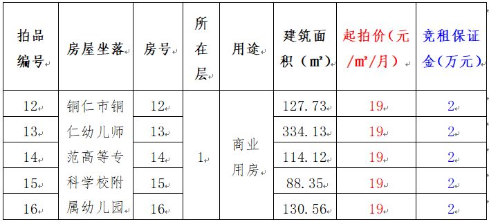 2、铜仁幼儿师范高等专科学校附属幼儿园12至16号商业房地产5间门面拍租,建筑面积:88.35-334.13㎡,拍租经营期限:5年。起拍价:19元/㎡/月;