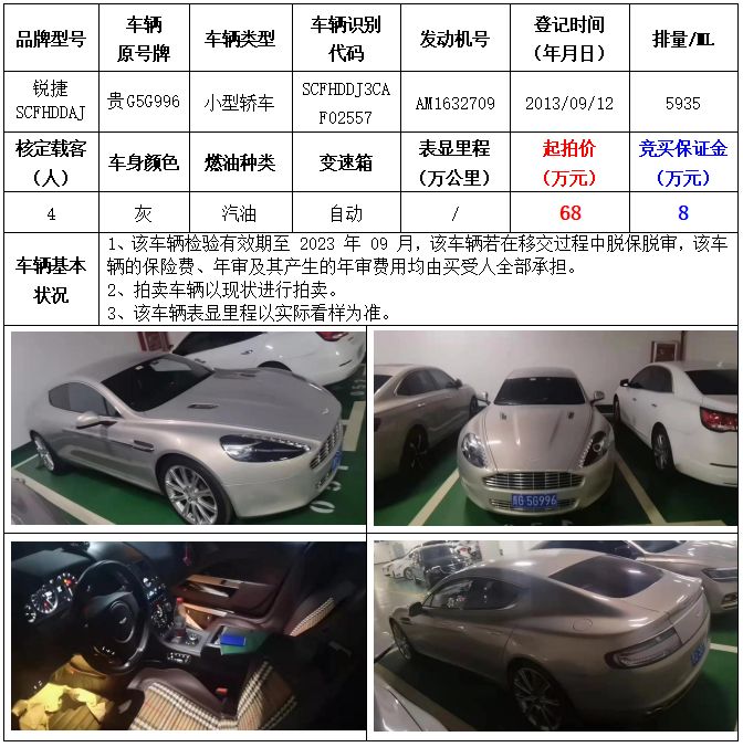 【已结束】阿斯顿马丁锐捷小型轿车拍卖公告