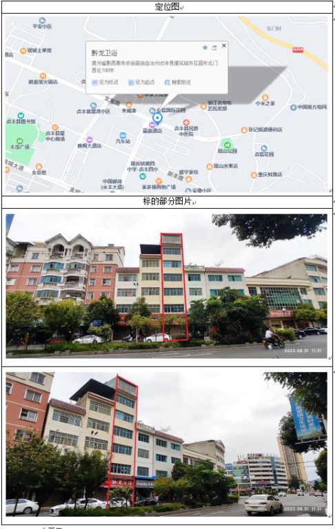 标的位于贞丰县龙场镇兴龙商贸区,房屋总层数为6层。产权证号:贞房权证龙场镇字第20120349号、贞国用2012第004022号,房屋证载建筑面积2278.03㎡(实测面积2263.59㎡),其中商用建筑面积:1818.71㎡,住宅建筑面积:459.32㎡;规划用途为商住,混合结构。证载土地面积1152㎡(实测面积1183.74㎡),地类用途为商住,使用权类型为出让,土地使用权终止日期为2058年9月6日。
