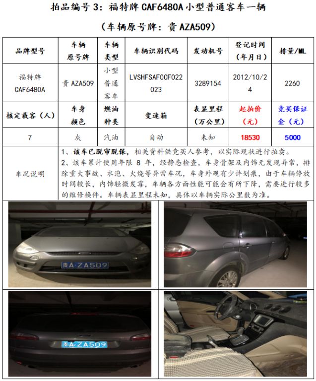 拍品编号3:福特牌CAF6480A小型普通客车一辆(车辆原号牌:贵AZA509);