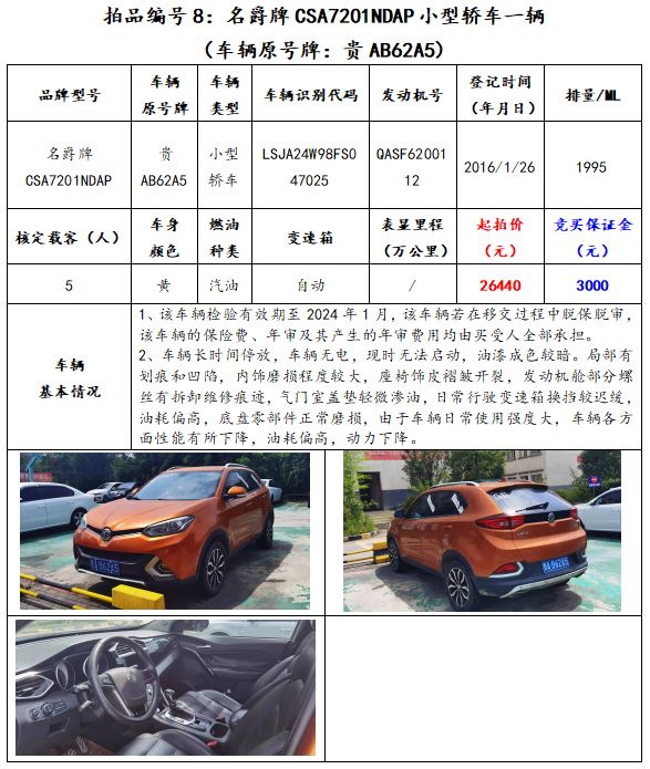 拍品编号9:名爵牌CSA7201NDAP小型轿车一辆(车辆原号牌:贵A78ZS9)。