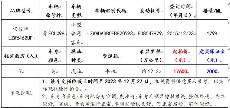拍品编号1:宝骏牌LZW6462UF小型普通客车一辆(车辆原号牌:贵FCL098);