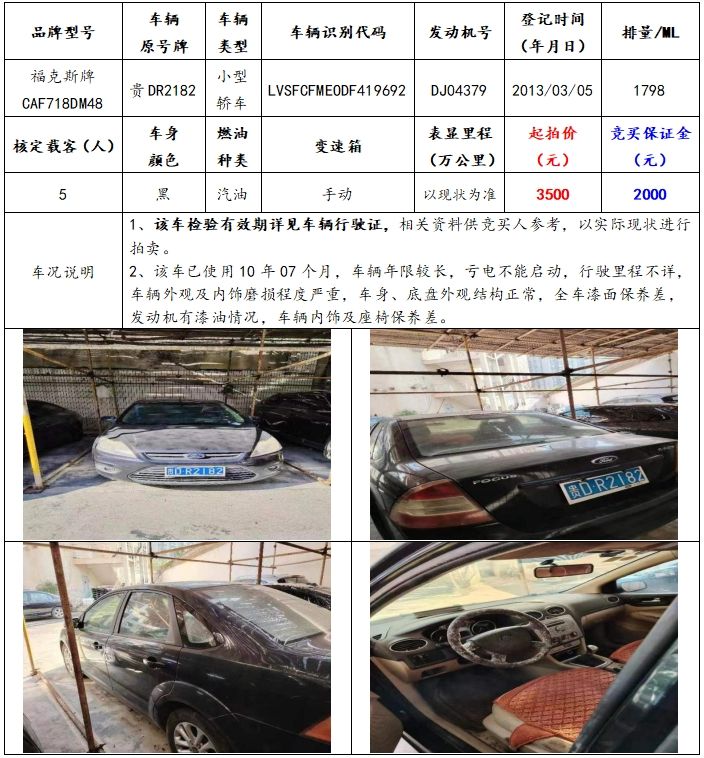 拍品编号3:福克斯牌CAF718DM48小型轿车一辆(车辆原号牌:贵DR2182);