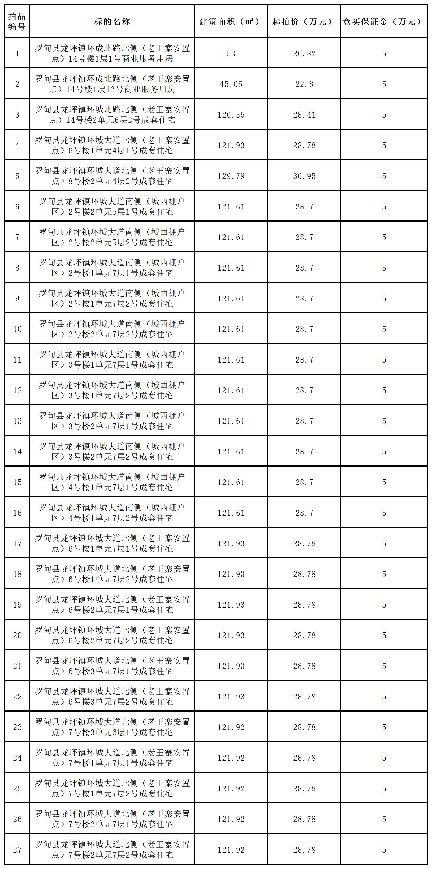本次拍卖标的为27处房产,具体分类为2间商业服务用房与25套成套住宅。其中,2间商业服务用房已完成产权登记手续,不动产权证号分别为:黔(2021)罗甸县不动产权第0010607号和黔(2021)罗甸县不动产权第0010608号,坐落于罗甸县龙坪镇环成北路北侧(老王寨安置点),权利类型:国有建设用地使用权/房屋所有权,权利性质:出让/市场化商品房,用途:商服用地/商业服务,共有宗地面积:12794㎡,房屋建筑面积分别为:53㎡和45.05㎡,房屋结构:钢筋混凝土结构,房屋总层数为8层,2间商业服务用房所在层数均为1层。