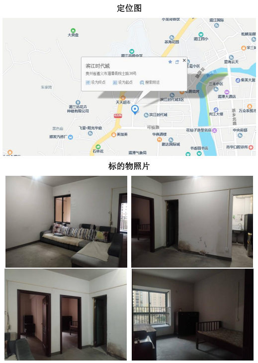 标的描述:标的坐落于贵州省遵义市湄潭县湄江街道西城区滨江时代城一期A2-5栋4-4号,房屋总层数为31层,拍卖标的所在层数为4层,权利类型:国有建设用地使用权/房屋(构筑物)所有权;权利性质:国有土地/出让/市场化商品房;用途:城镇住宅用地/成套住宅;房屋建筑面积:79.65㎡,房屋结构:钢筋混凝土结构。