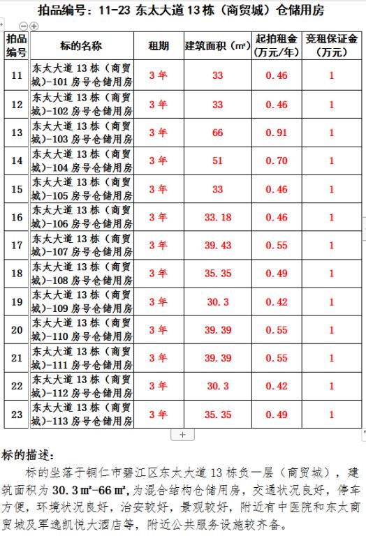 4、东太大道13栋(商贸城)仓储(13间)3年租赁权(建筑面积30.3㎡-66㎡/间);起拍租金单价(每间):0.42万元/年-0.91万元/年;竞租保证金(每间):1万元;