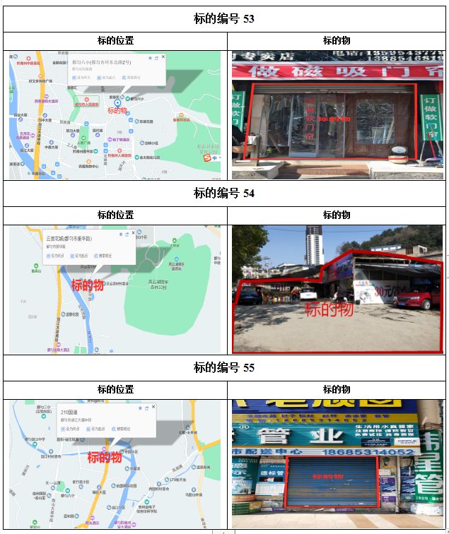 1、都匀市剑江中路、环东北路、文明路、民族路、胜利路、会云桥、育英巷等62处门面3年租赁权,面积约5㎡-137.74㎡;