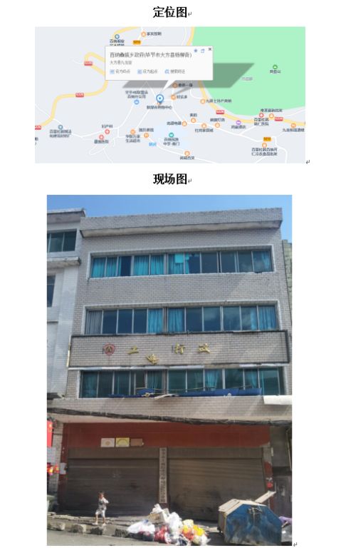 1、该标的位于大方县百纳乡政府旁,建成于2003年,占地面积264.9㎡。共四层,分为前后两栋。前栋:一层为门面2间,面积合计76.83㎡,现为闲置状态;二、三层面积分别为116.7㎡;四层面积为56.05㎡;前栋面积共计366.28㎡。后栋:半地下层在乡政府院内,面积为38.9㎡;一、二层面积分别为137.43㎡;三层面积为95.73㎡;后栋面积共计409.48㎡。前后两栋建筑面积共计为775.77㎡。
