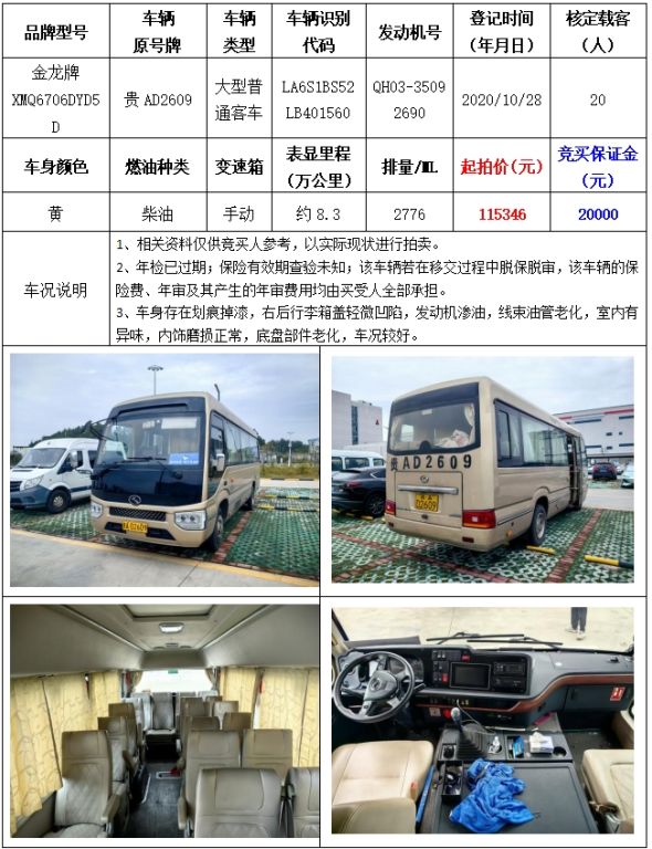 拍品编号1:金龙牌XMQ6706DYD5D大型普通客车一辆