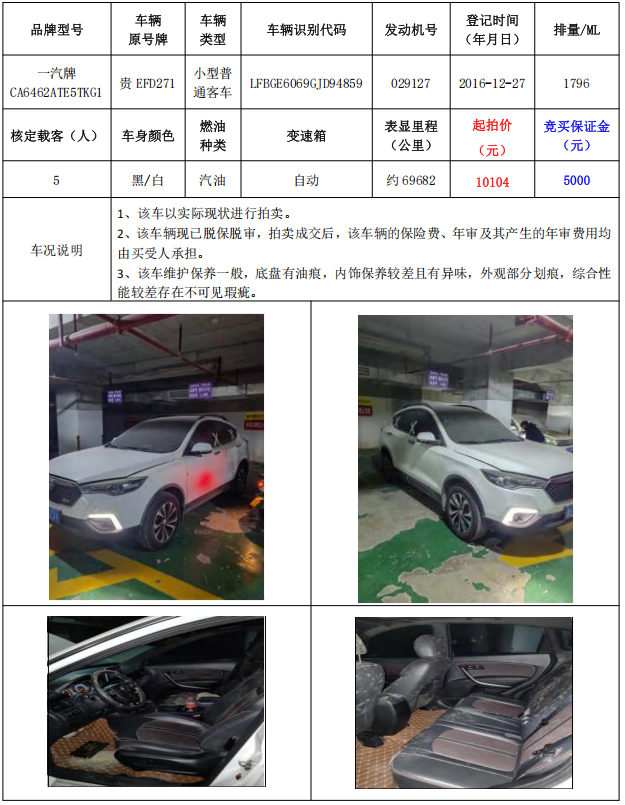 拍品编号1:一汽牌CA6462ATE5TKG1小型普通客车1辆(车辆原号牌:贵EFD271)