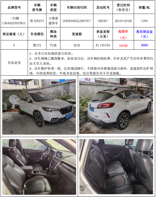 拍品编号3:一汽牌CA6462ATE5TKG1小型普通客车1辆(车辆原号牌:贵EFD273)