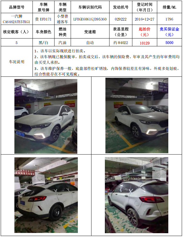 拍品编号4:一汽牌CA6462ATE5TKG1小型普通客车1辆(车辆原号牌:贵EFD171)