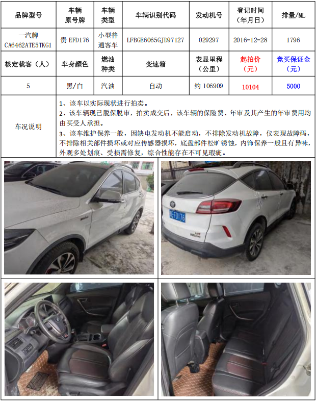 拍品编号2:一汽牌CA6462ATE5TKG1小型普通客车1辆(车辆原号牌:贵EFD175)