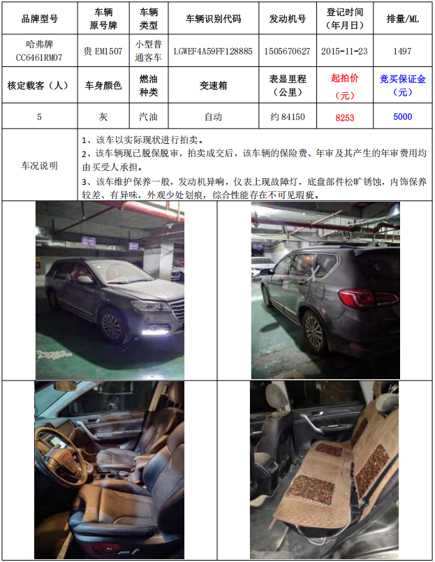 拍品编号6:哈弗牌CC6461RM07小型普通客车1辆(车辆原号牌:贵EM1507)