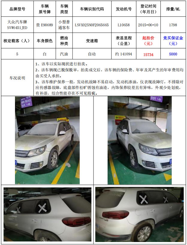 拍品编号7:大众汽车牌SVW6451JED小型普通客车1辆(车辆原号牌:贵E90689)